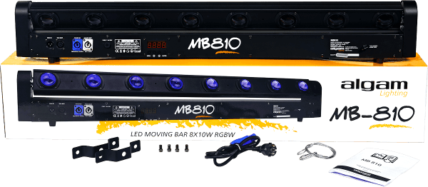 The MB810 is a motorised LED bar offering 8 powerful and independently controllable 10-watt RGBW LEDs with a 2.5° beam angle for the most colourful and captivating effects. Its 22 internal programmes allow for a wide range of effects from sweep to chase to strobe. Its quiet, high-energy motorisation allows tilt movements up to 265 degrees with fantastic responsiveness. The MB810 can operate in music-controlled, automatic or DMX mode, with 9 or 38 control channels available.